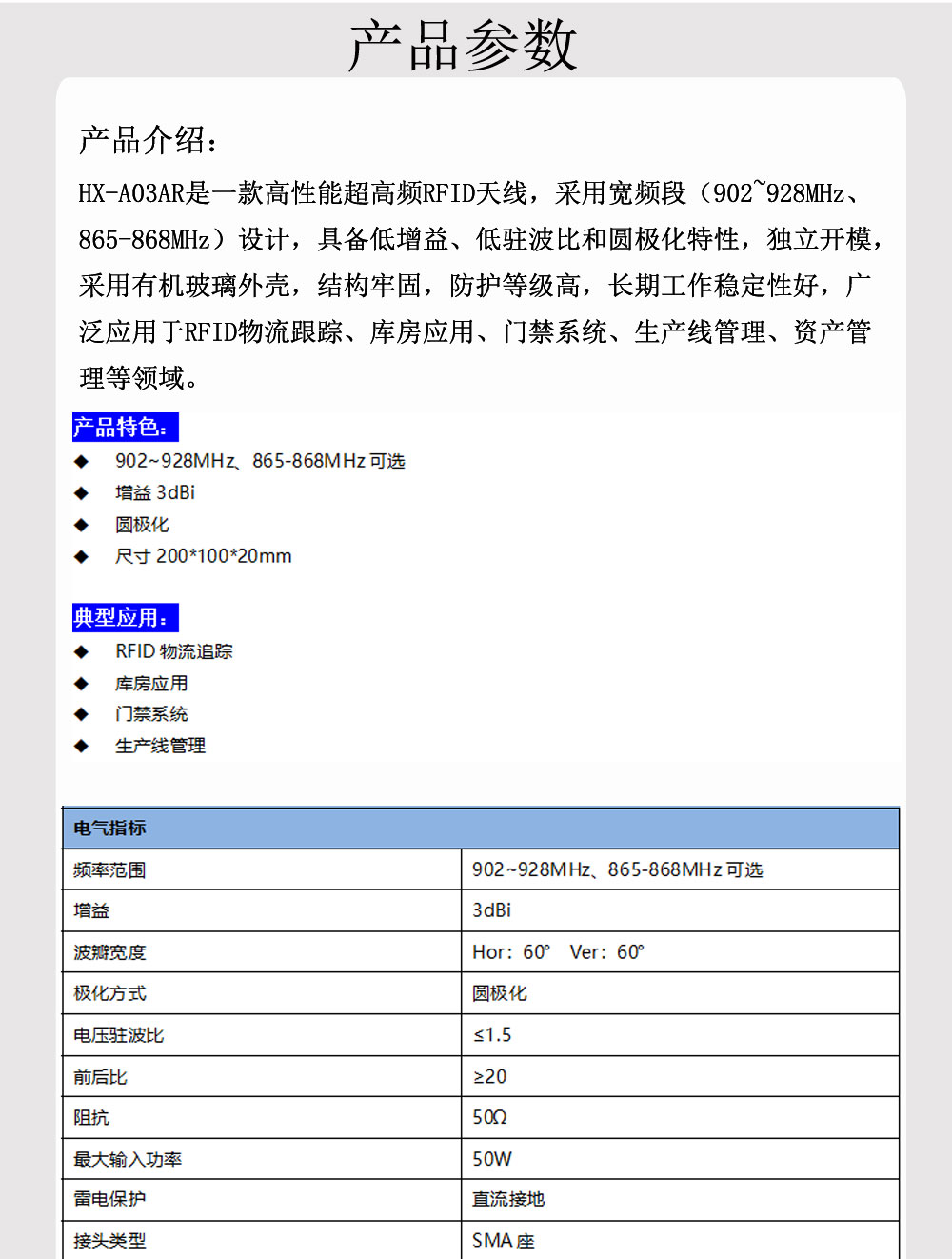 HX-A03AR是一款高性能超高频RFID天线,采用宽频段(902~928MHz、865-868MHz)设计,具备低增益、低驻波比和圆极化特性,独立开模,采用有机玻璃外壳,结构牢固,防护等级高,长期工作稳定性好,广泛应用于RFID物流跟踪、库房应用、门禁系统、生产线管理、资产管理等领域。